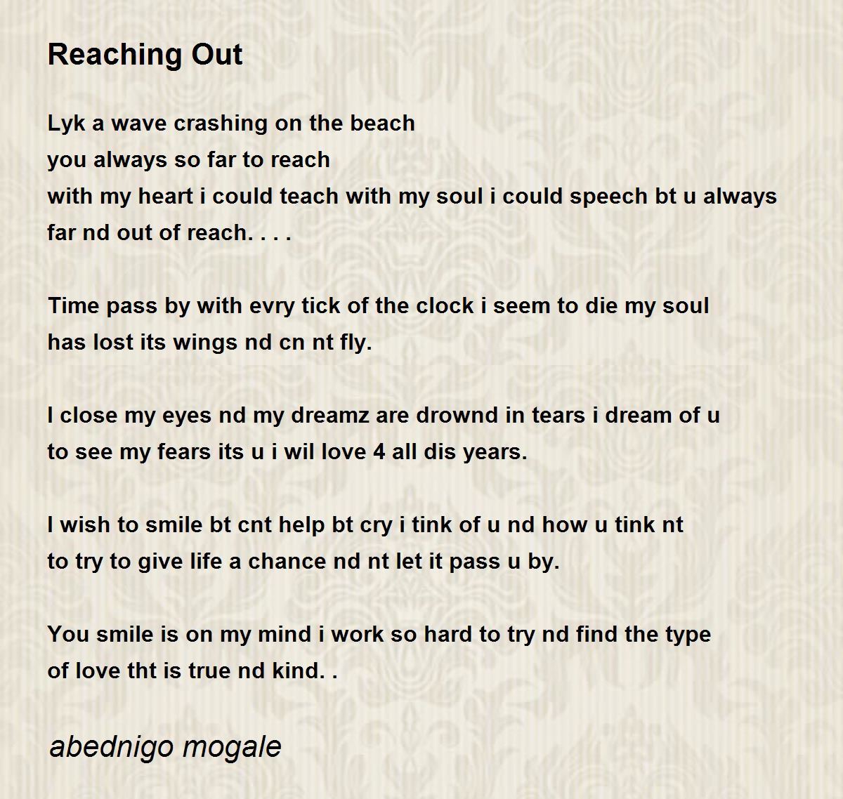 I wish to smile bt cnt help bt cry i tink of u nd how u tink nt to try to give life a chance nd nt let it pass u by.