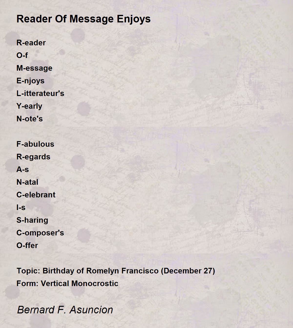 Topic: Birthday of Romelyn Francisco (December 27)
