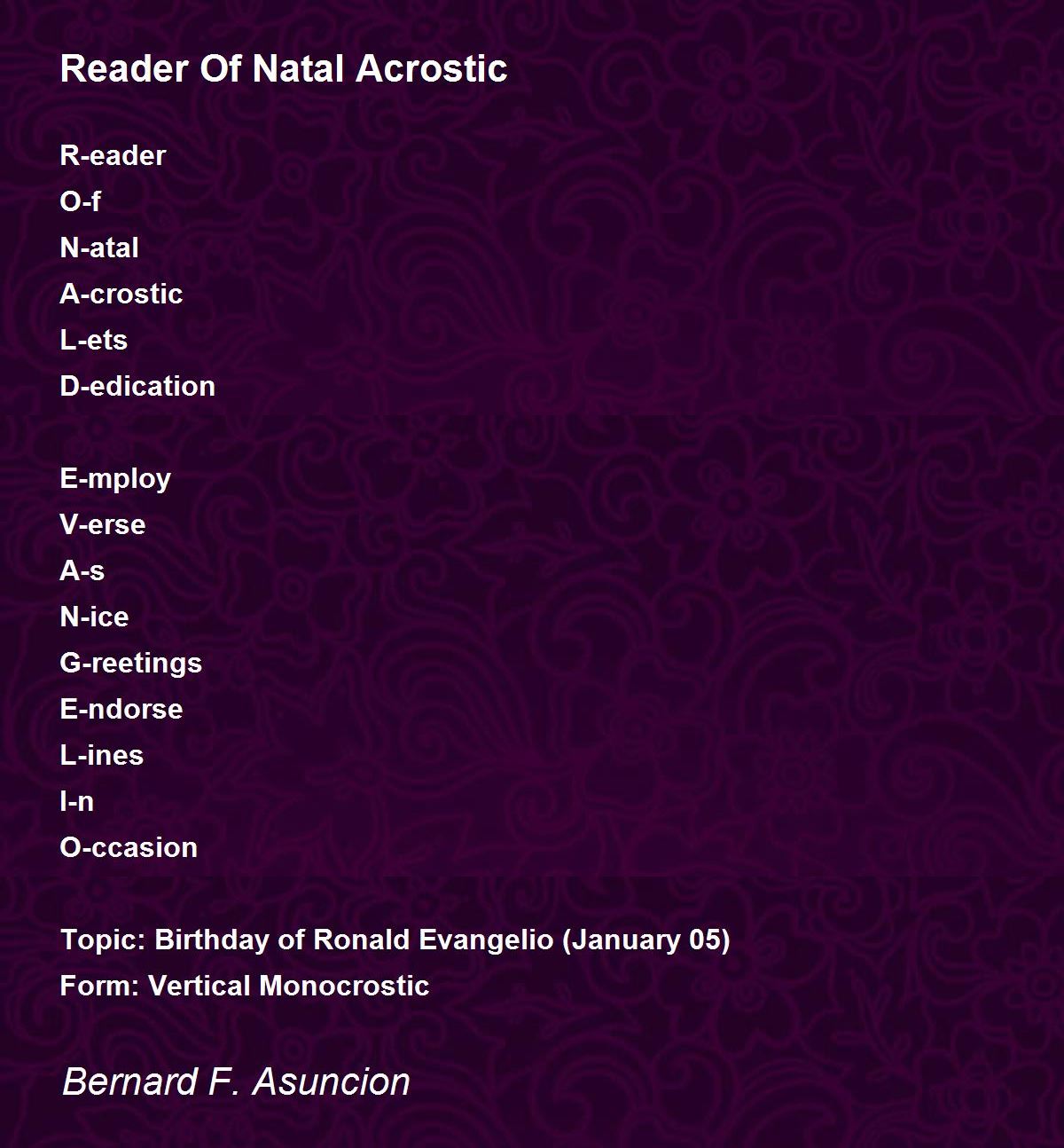 Happy Birthday, dear Ronald! May you be Blessed in Abundance now and for always, but pay attention to all blessings that you have got, Ronald. Through the poem site of Rev. Bernard I sent these congratulations.to you. Enjoy the moments, Ronald. My best wishes to Rev. Bernard and to you.