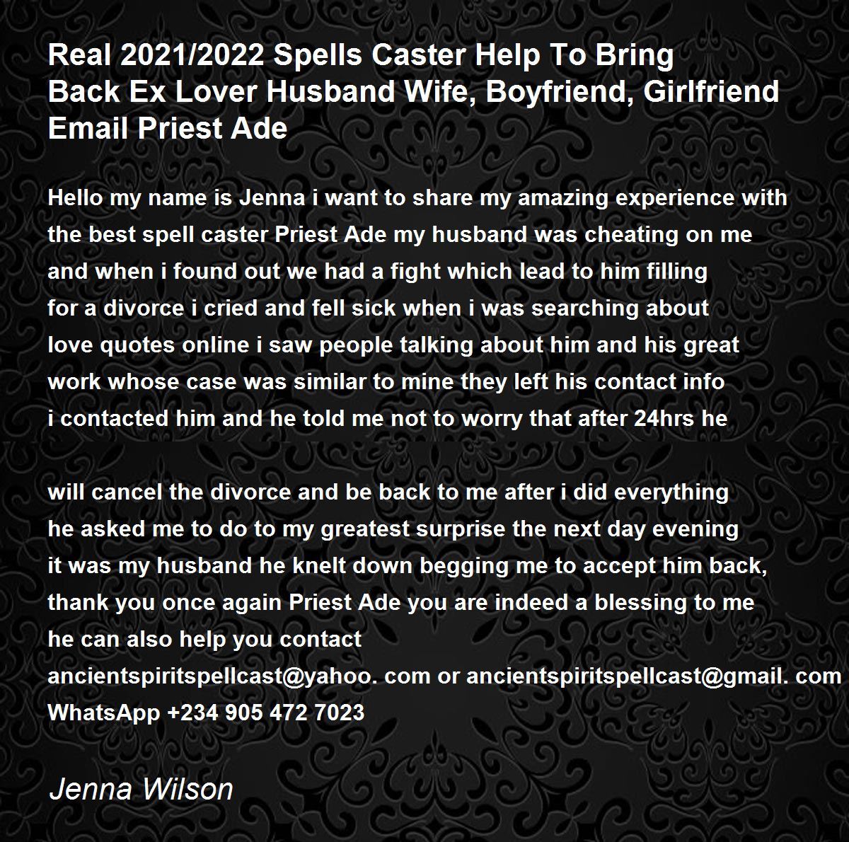 Hello my name is Jenna i want to share my amazing experience with the best spell caster Priest Ade my husband was cheating on me and when i found out we had a fight which lead to him filling for a divorce i cried and fell sick when i was searching about love quotes online i saw people talking about him and his great work whose case was similar to mine they left his contact info i contacted him and he told me not to worry that after 24hrs he will cancel the divorce and be back to me after i did everything he asked me to do to my greatest surprise the next day evening it was my husband he knelt down begging me to accept him back, thank you once again Priest Ade you are indeed a blessing to me he can also help you contact