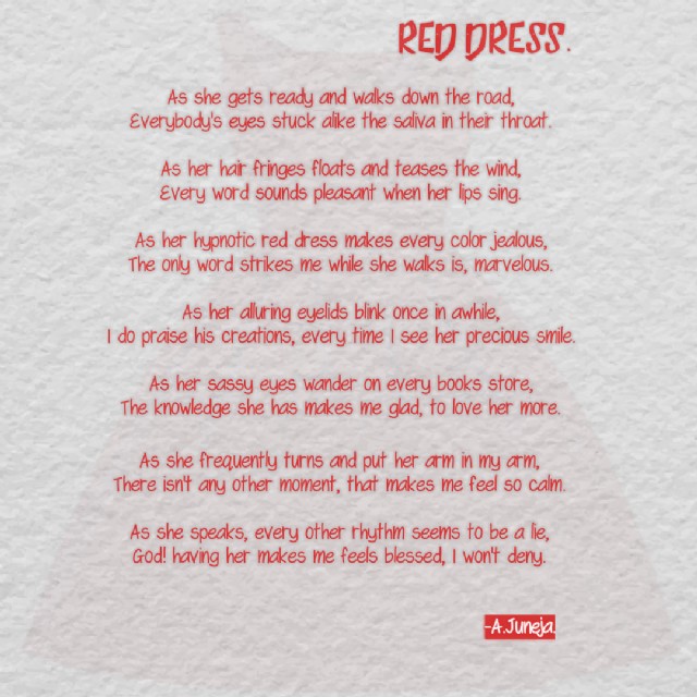 Wonderful sketch of a charming and graceful lady created by lovely words. Thanks, AJ. As her hypnotic red dress makes every color jealous, The only word strikes me while she walks is, marvelous.
