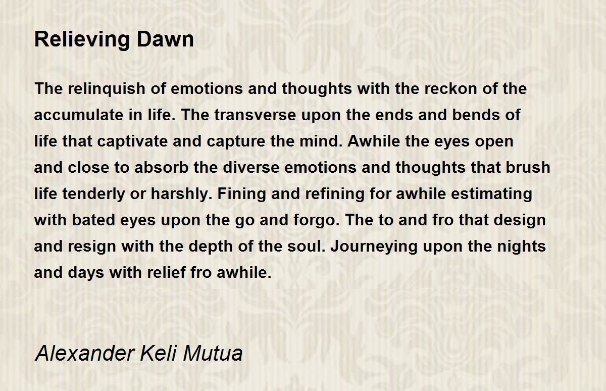 The relinquish of emotions and thoughts with the reckon of the accumulate in life. The transverse upon the ends and bends of life that captivate and capture the mind. Awhile the eyes open and close to absorb the diverse emotions and thoughts that brush life tenderly or harshly. Fining and refining for awhile estimating with bated eyes upon the go and forgo. The to and fro that design and resign with the depth of the soul. Journeying upon the nights and days with relief fro awhile.