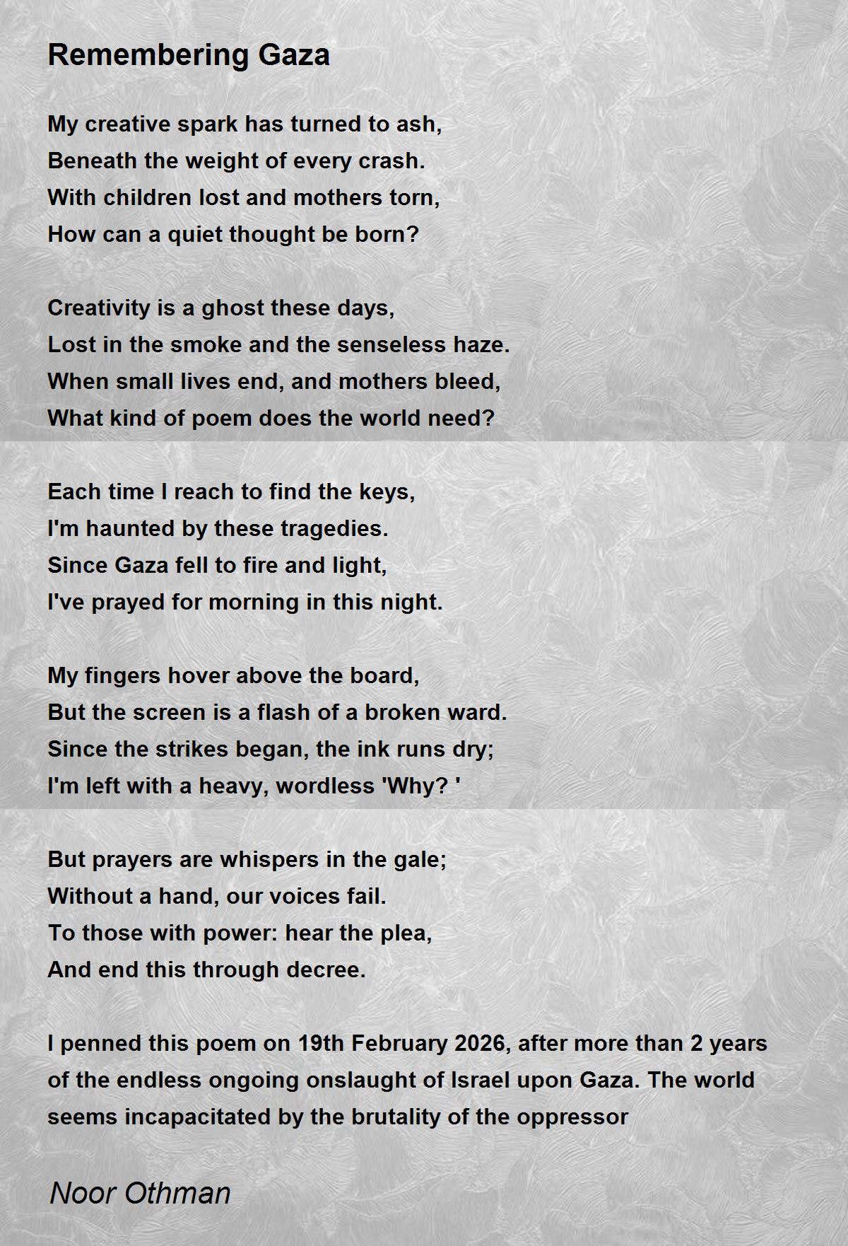I penned this poem on 19th February 2026, after more than 2 years of the endless ongoing onslaught of Israel upon Gaza. The world seems incapacitated by the brutality of the oppressor
