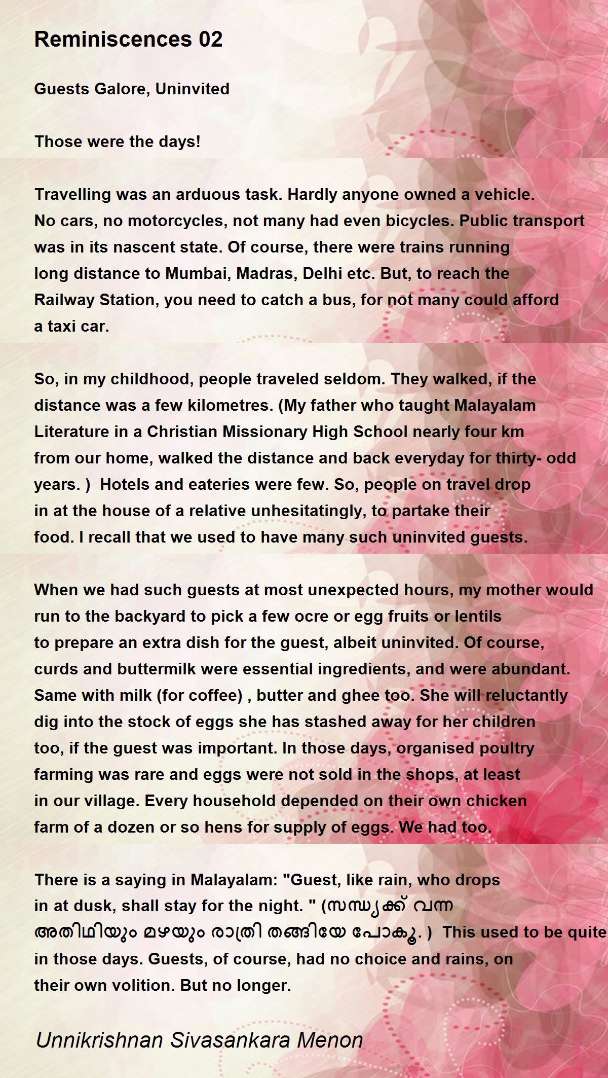 There is a saying in Malayalam: "Guest, like rain, who drops in at dusk, shall stay for the night." (സന്ധ്യക്ക് വന്ന അതിഥിയും മഴയും രാത്രി തങ്ങിയേ പോകൂ.) This used to be quite true in those days. Guests, of course, had no choice and rains, on their own volition. But no longer.