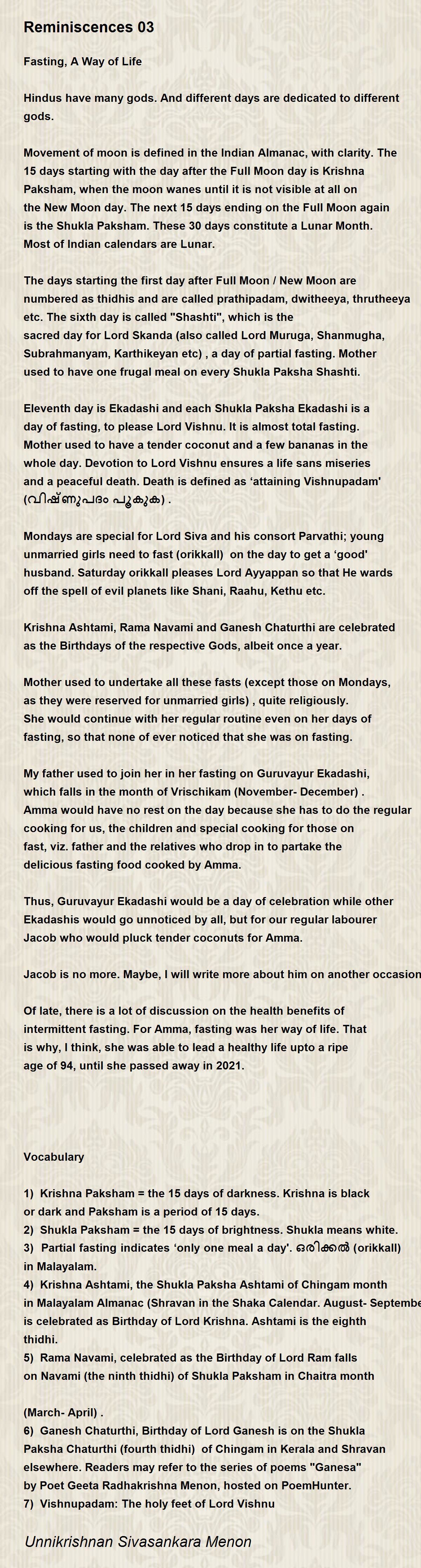 Eleventh day is Ekadashi and each Shukla Paksha Ekadashi is a day of fasting, to please Lord Vishnu. It is almost total fasting. Mother used to have a tender coconut and a few bananas in the whole day. Devotion to Lord Vishnu ensures a life sans miseries and a peaceful death. Death is defined as ‘attaining Vishnupadam' (വിഷ്ണുപദം പൂകുക) .