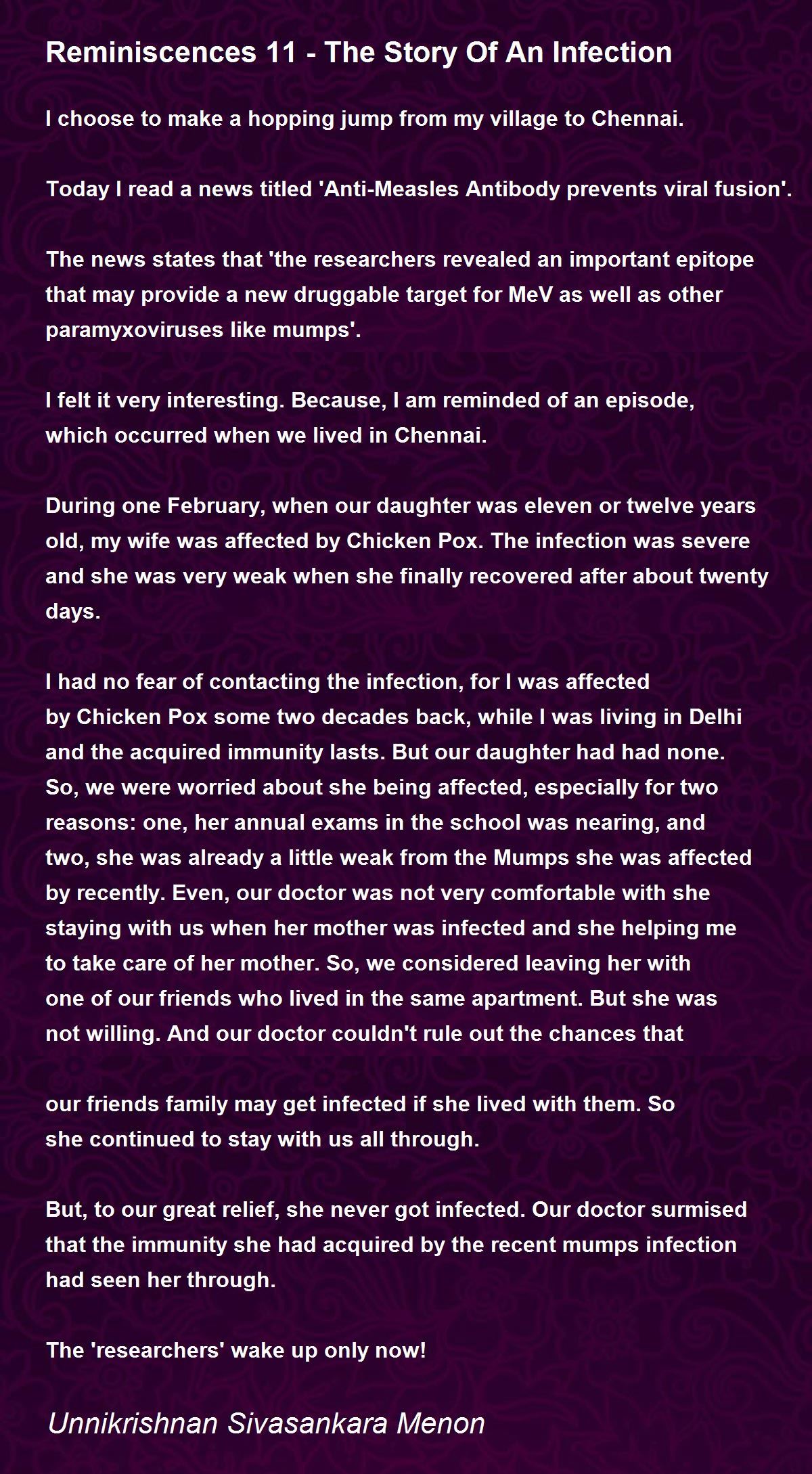 During one February, when our daughter was eleven or twelve years old, my wife was affected by Chicken Pox. The infection was severe and she was very weak when she finally recovered after about twenty days.