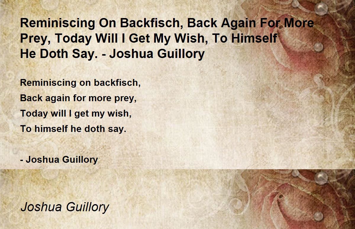 Reminiscing on backfisch, Back again for more prey, Today will I get my wish, To himself he doth say. - Joshua Guillory
