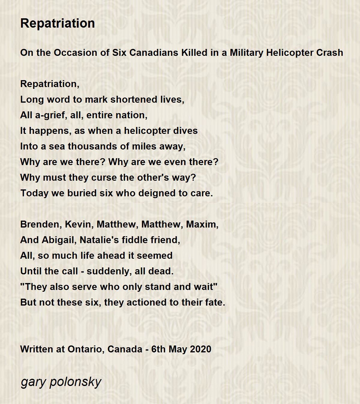 On the Occasion of Six Canadians Killed in a Military Helicopter Crash