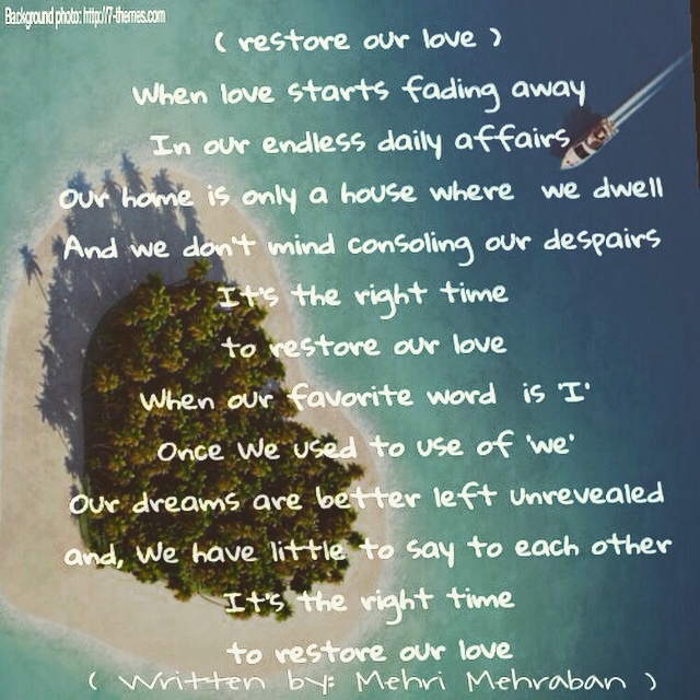 t's the right time to restore our love When our favorite word is 'I' Our dreams are better left unrevealed........ a very fine poem on love, feeling, emotions, struggle and hope. thank you dear poetess.. tony