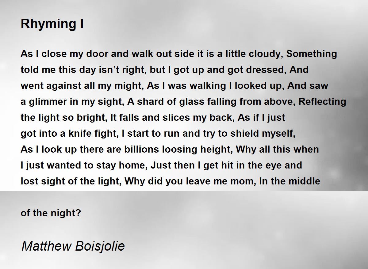 As I close my door and walk out side it is a little cloudy, Something told me this day isn’t right, but I got up and got dressed, And went against all my might, As I was walking I looked up, And saw a glimmer in my sight, A shard of glass falling from above, Reflecting the light so bright, It falls and slices my back, As if I just got into a knife fight, I start to run and try to shield myself, As I look up there are billions loosing height, Why all this when I just wanted to stay home, Just then I get hit in the eye and lost sight of the light, Why did you leave me mom, In the middle of the night?