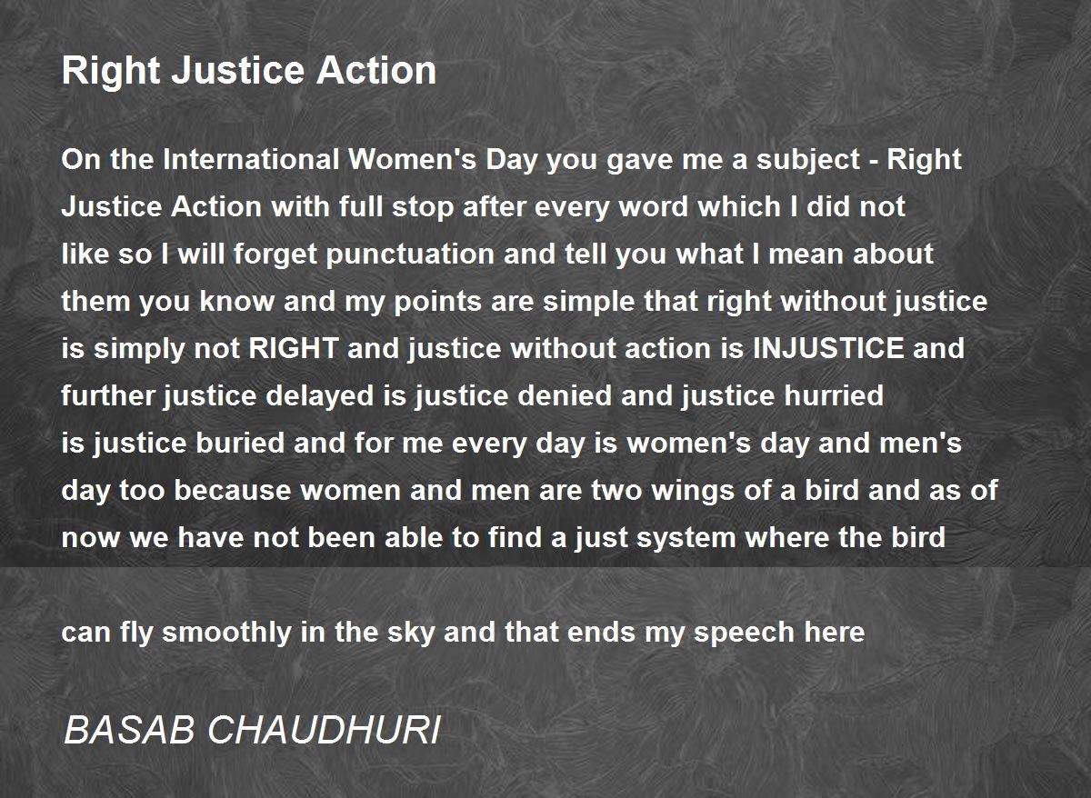 On the International Women's Day you gave me a subject - Right Justice Action with full stop after every word which I did not like so I will forget punctuation and tell you what I mean about them you know and my points are simple that right without justice is simply not RIGHT and justice without action is INJUSTICE and further justice delayed is justice denied and justice hurried is justice buried and for me every day is women's day and men's day too because women and men are two wings of a bird and as of now we have not been able to find a just system where the bird can fly smoothly in the sky and that ends my speech here