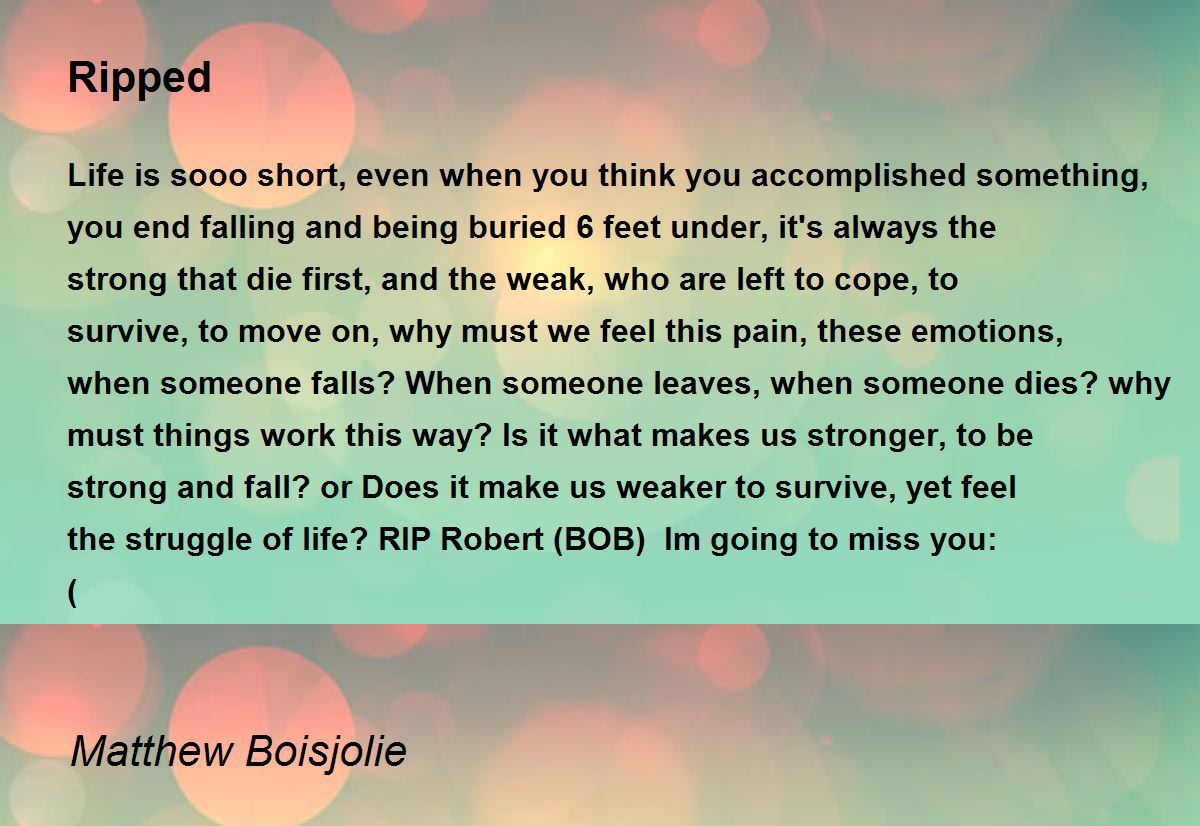 Life is sooo short, even when you think you accomplished something, you end falling and being buried 6 feet under, it's always the strong that die first, and the weak, who are left to cope, to survive, to move on, why must we feel this pain, these emotions, when someone falls? When someone leaves, when someone dies? why must things work this way? Is it what makes us stronger, to be strong and fall? or Does it make us weaker to survive, yet feel the struggle of life? RIP Robert (BOB) Im going to miss you: (