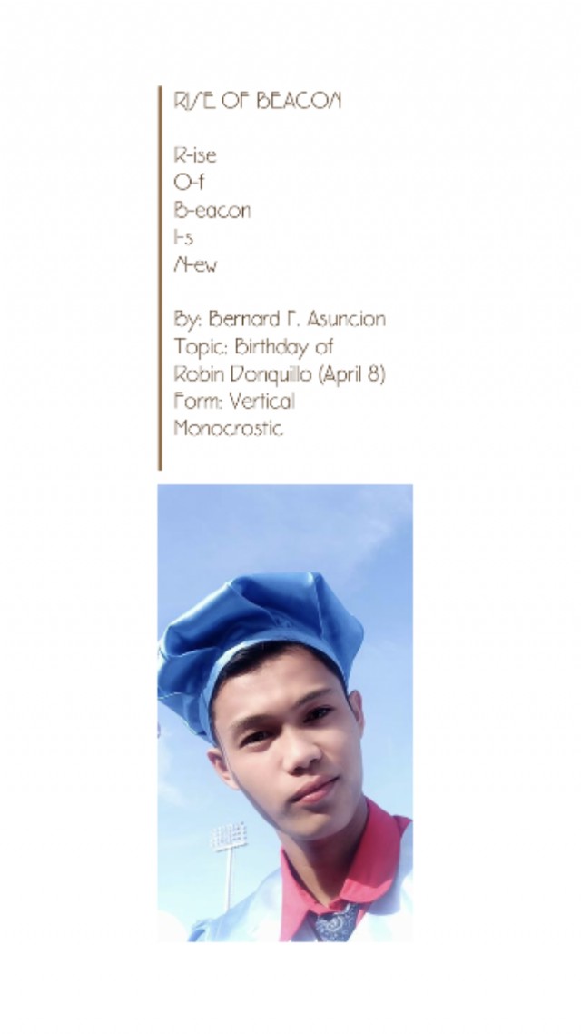 R-ise O-f B-eacon I-s N-ew Topic: Birthday of Robin Donquillo (April 8) Form: Vertical Monocrostic