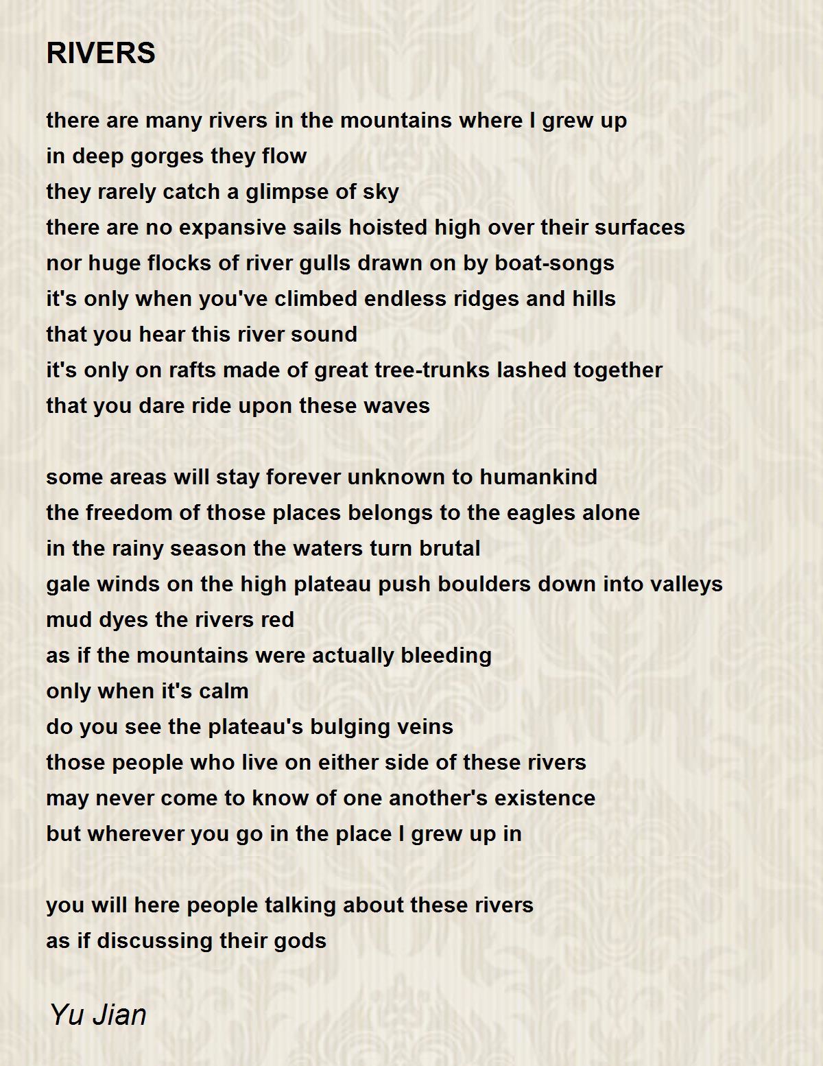 mud dyes the rivers red as if the mountains were actually bleeding only when it's calm do you see the plateau's bulging veins- - - - - - - you have a magic pen, it writes the best descriptives ever! ! ! ! I have read 5 of your poems tonight and every one of them is a starry-eyed 10- - - very very well-written
