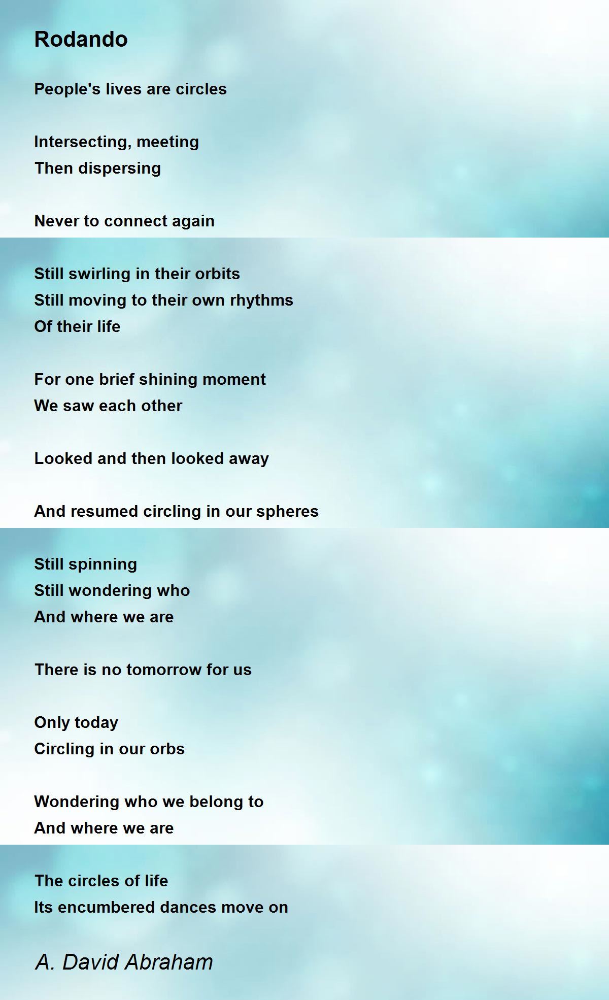 Life is an eternal swirl, Of ups and downs And turn arounds. So well expressed n this poem. In poetic, picturesque frames that feel and move and make the reader know it.
