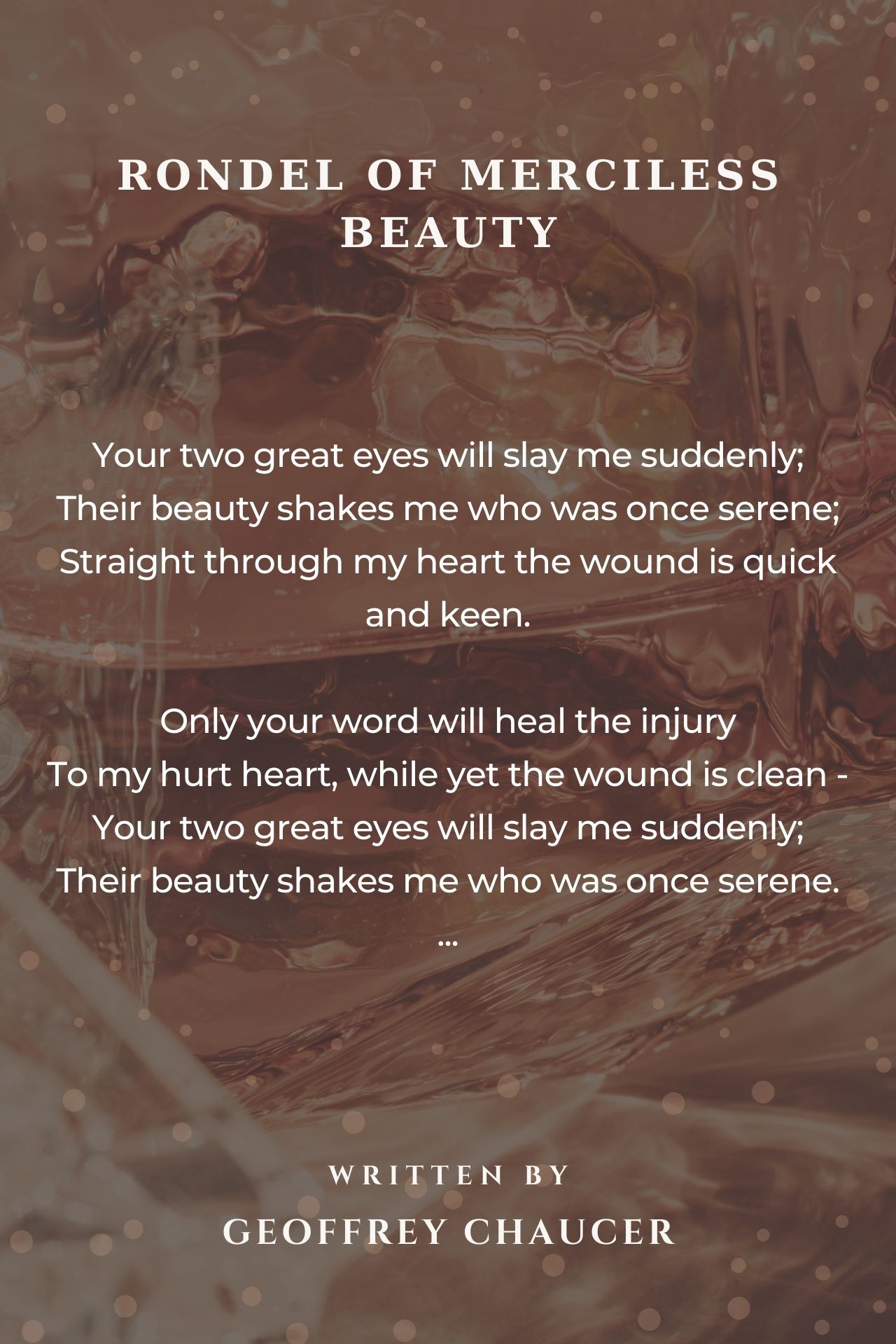 A rondel is written to demonstrate a poet's skill in composing a difficult French verse form. Those who take it to heart are missing the fun of the whole thing. The poet is using such a form as a practice in prosody. Concentrate on the rime-scheme and the repetition of certain lines in the refrain. It's similar to a problem in math, only words replace numbers! Don't get all emotional and lose your power of speaking, please! Enjoy it for what it is - a 14th century Middle English poem modeled on a French love poem!