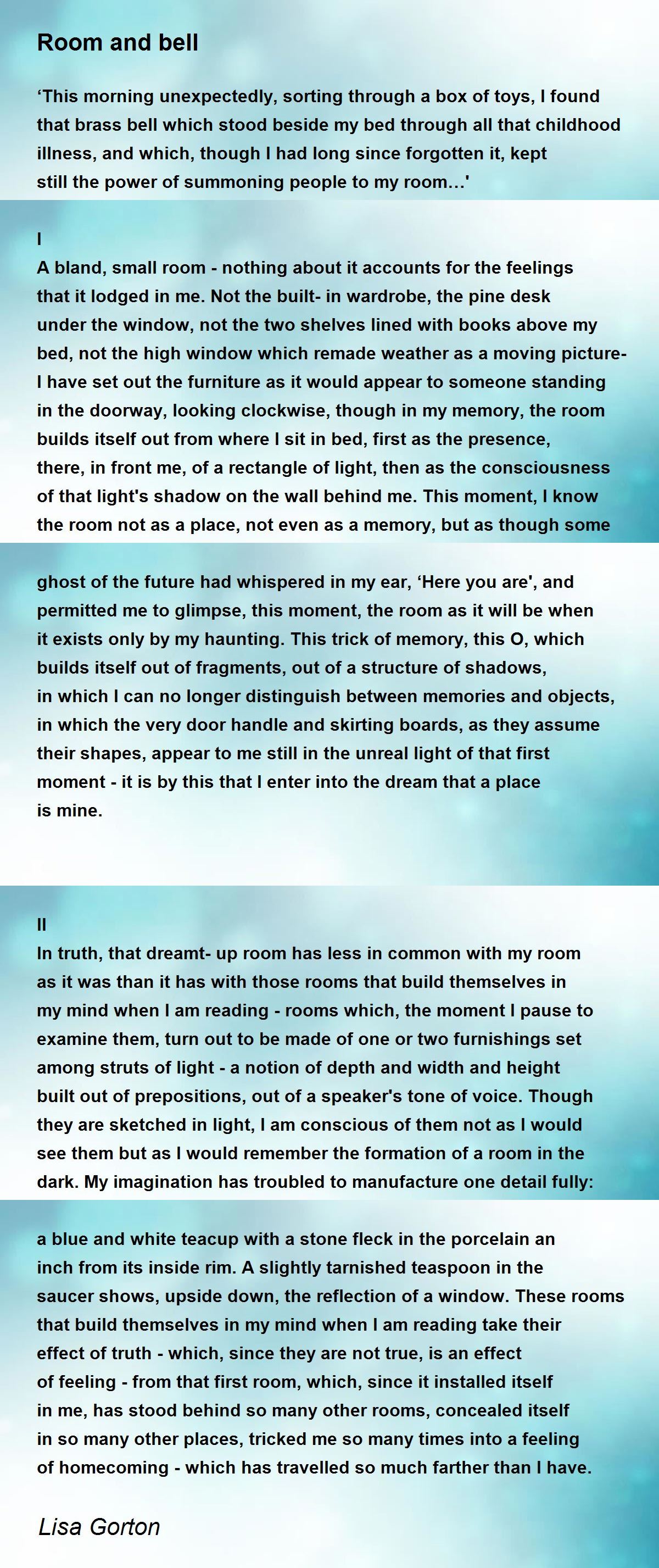 A bland, small room - nothing about it accounts for the feelings that it lodged in me. Not the built-in wardrobe, the pine desk under the window, not the two shelves lined with books above my bed, not the high window which remade weather as a moving picture- I have set out the furniture as it would appear to someone standing in the doorway, looking clockwise, though in my memory, the room builds itself out from where I sit in bed, first as the presence, there, in front me, of a rectangle of light, then as the consciousness of that light's shadow on the wall behind me. This moment, I know the room not as a place, not even as a memory, but as though some ghost of the future had whispered in my ear, ‘Here you are', and permitted me to glimpse, this moment, the room as it will be when it exists only by my haunting. This trick of memory, this O, which builds itself out of fragments, out of a structure of shadows, in which I can no longer distinguish between memories and objects, in which the very door handle and skirting boards, as they assume their shapes, appear to me still in the unreal light of that first moment - it is by this that I enter into the dream that a place is mine.