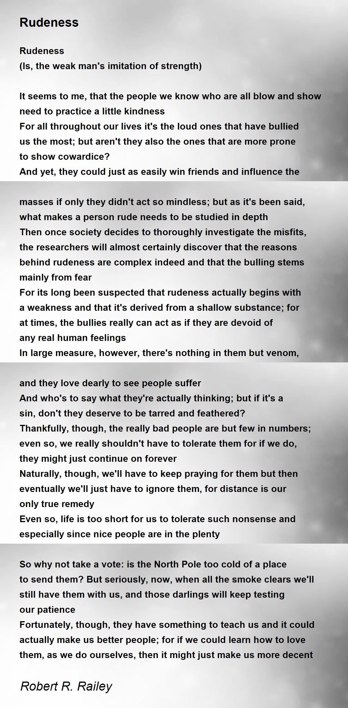 For its long been suspected that rudeness actually begins with a weakness and that it's derived from a shallow substance; for at times, the bullies really can act as if they are devoid of any real human feelings