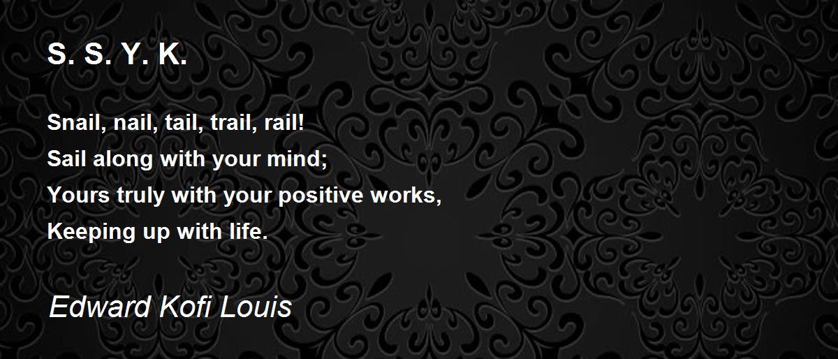 Snail, nail, tail, trail, rail! Sail along with your mind; Yours truly with your positive works, Keeping up with life.