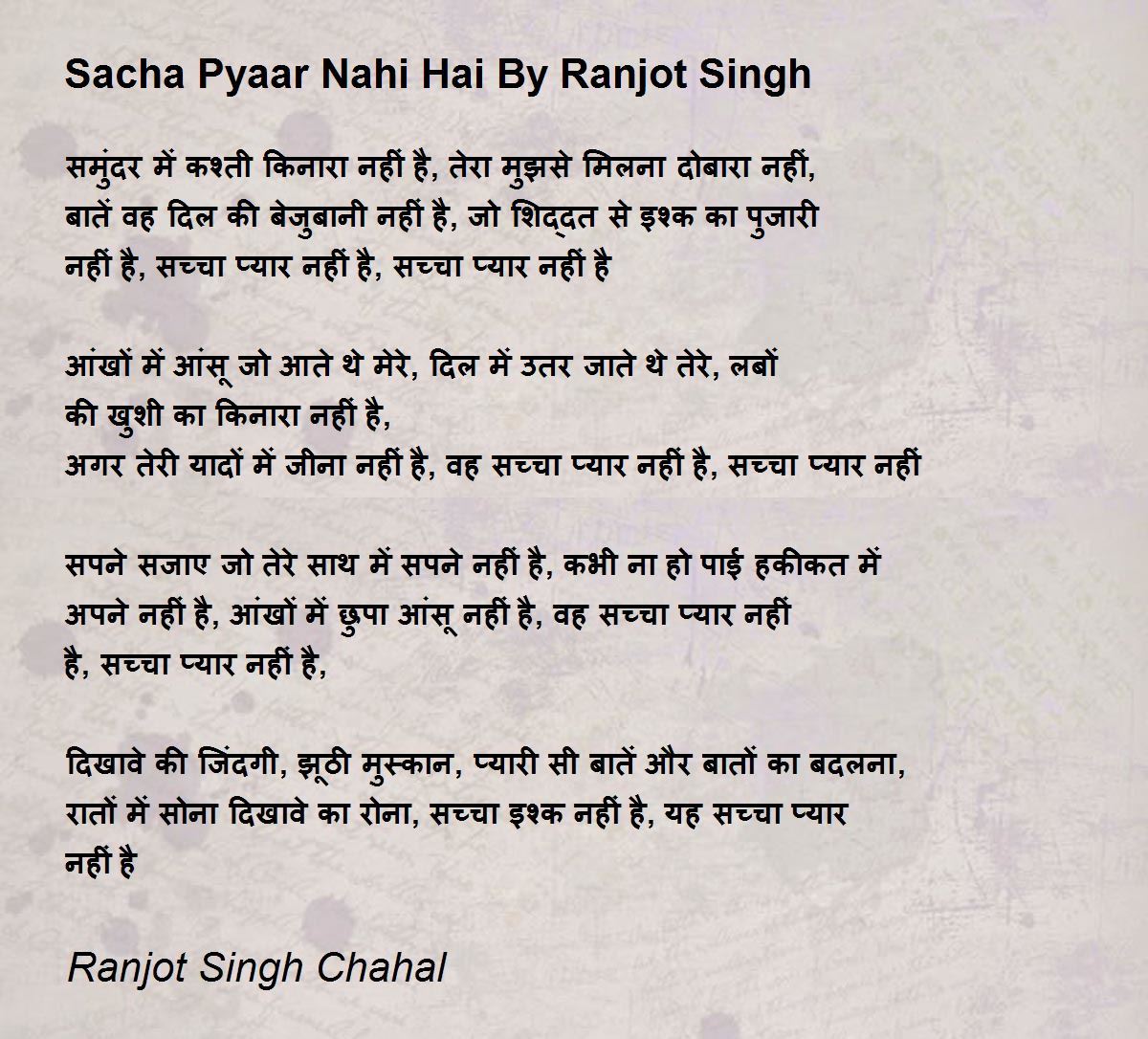 समुंदर में कश्ती किनारा नहीं है, तेरा मुझसे मिलना दोबारा नहीं, बातें वह दिल की बेजुबानी नहीं है, जो शिद्दत से इश्क का पुजारी नहीं है, सच्चा प्यार नहीं है, सच्चा प्यार नहीं है