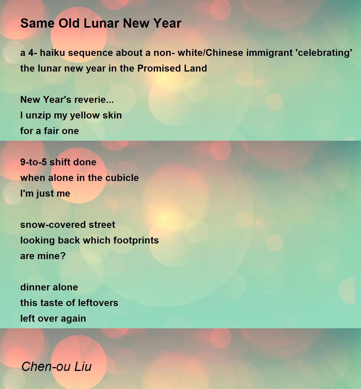 a 4-haiku sequence about a non-white/Chinese immigrant 'celebrating' the lunar new year in the Promised Land