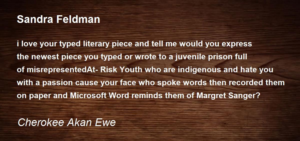 i love your typed literary piece and tell me would you express the newest piece you typed or wrote to a juvenile prison full of misrepresentedAt-Risk Youth who are indigenous and hate you with a passion cause your face who spoke words then recorded them on paper and Microsoft Word reminds them of Margret Sanger?