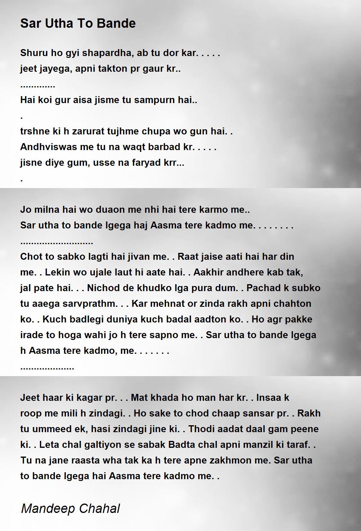 Jeet haar ki kagar pr... Mat khada ho man har kr.. Insaa k roop me mili h zindagi.. Ho sake to chod chaap sansar pr.. Rakh tu ummeed ek, hasi zindagi jine ki.. Thodi aadat daal gam peene ki.. Leta chal galtiyon se sabak Badta chal apni manzil ki taraf.. Tu na jane raasta wha tak ka h tere apne zakhmon me. Sar utha to bande lgega hai Aasma tere kadmo me..