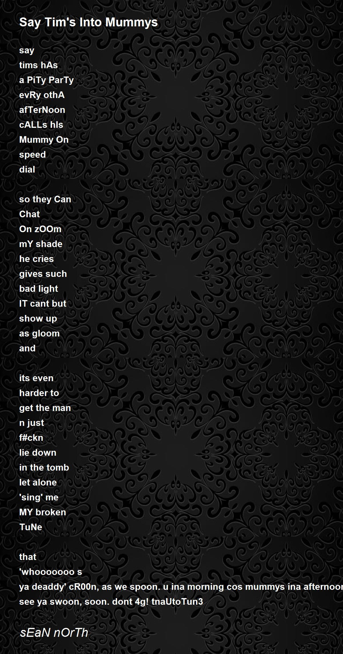 ya deaddy' cR00n, as we spoon. u ina morning cos mummys ina afternoon.yeah see ya swoon, soon. dont 4g! tnaUtoTun3