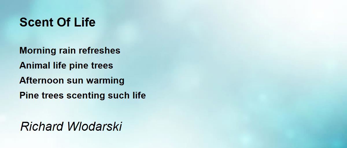 Morning rain refreshes Animal life pine trees Afternoon sun warming Pine trees scenting such life
