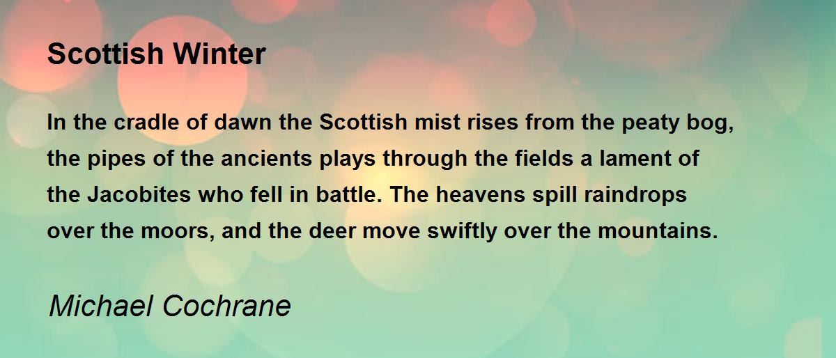 In the cradle of dawn the Scottish mist rises from the peaty bog, the pipes of the ancients plays through the fields a lament of the Jacobites who fell in battle. The heavens spill raindrops over the moors, and the deer move swiftly over the mountains.