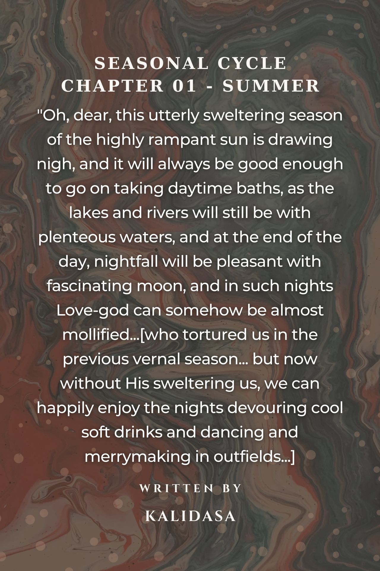 'Oh, dear, this utterly sweltering season of the highly rampant sun is drawing nigh, and it will always be good enough to go on taking daytime baths, as the lakes and rivers will still be with plenteous waters, and at the end of the day, nightfall will be pleasant with fascinating moon, and in such nights Love-god can somehow be almost mollified...[who tortured us in the previous vernal season... but now without His sweltering us, we can happily enjoy the nights devouring cool soft drinks and dancing and merrymaking in outfields...]