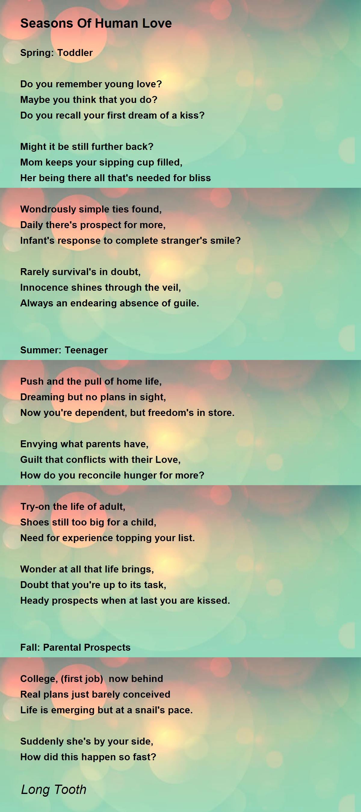 I like this accounting of how we grow in love, from baby to teen, then into adulthood, and finally into old folksy love. But in all stages of life, love proves to be very important. It seems that love gets us through all of life's difficulties. And without love, there is an emptiness, a void that slows down our progress. We'll still make it to the finish line, nothing will stop that. But the race is always best run with love at our side. Very good analogies in your poem.