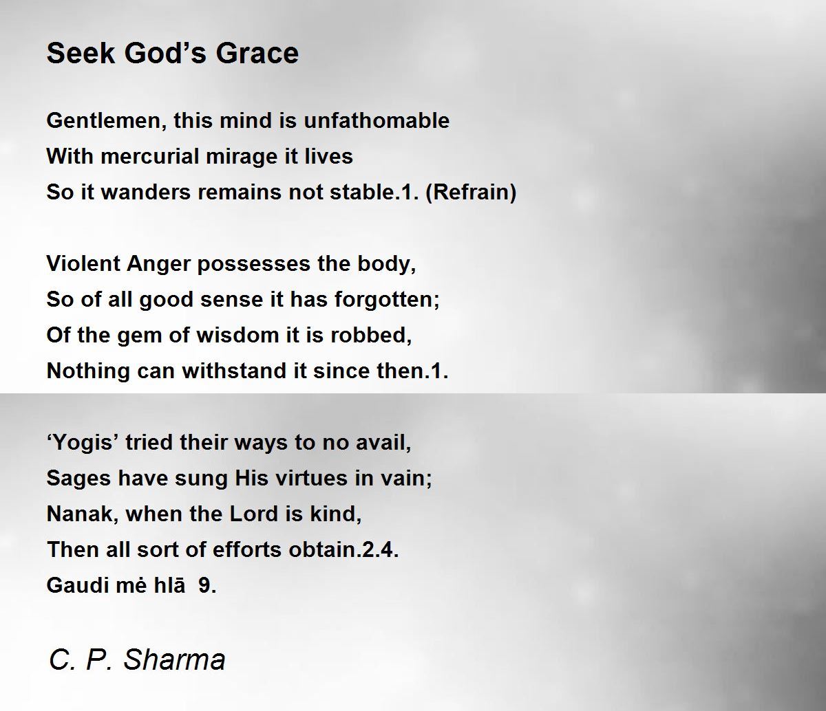 From: Richard Jarboe (stockton United States; Male; 60) To: C. P. Sharma Date Time: 2/25/2009 7: 11: 00 AM (GMT -6: 00) Subject: God's Grace When the ocean in your head is a raging sea, only the recognition of God's Grace can calm the waters. So true, good work, richard