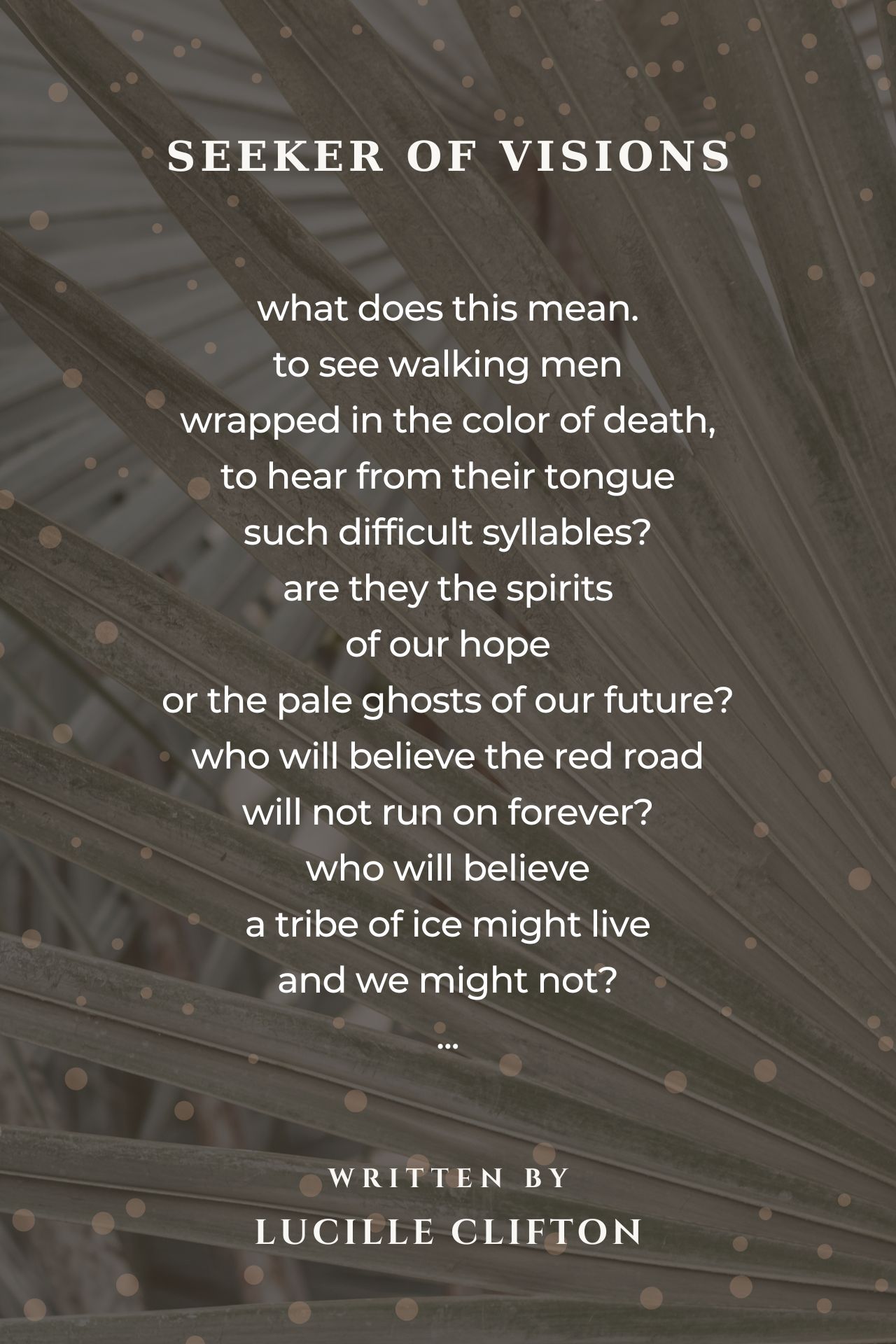 OH, DEAR LUCILLE, DARE TO SPEAK OUT AND NOT CONSTANTLY IN RIDDLES. Saddest that you passed away before your day. CONGRATULATIONS being chosen as the MODERN POEM OF THE DAY. HURRAY! ! You have won so many more important prizes, WOW! You ARE already before Maya Angelou, BUT you was still speaking in secret terms concerning racial problemes. A terrible life in a free country. Free only for the whites.