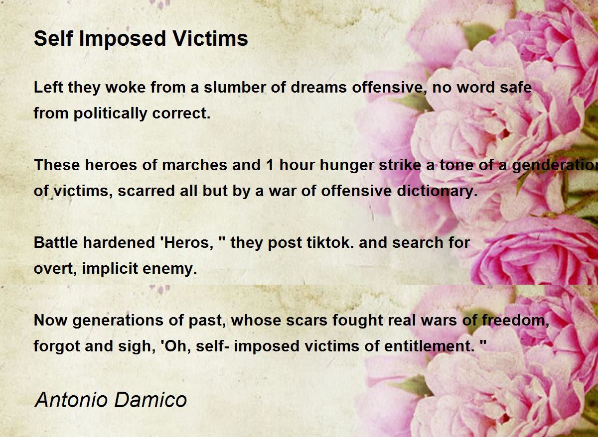 Now generations of past, whose scars fought real wars of freedom, forgot and sigh, 'Oh, self-imposed victims of entitlement."