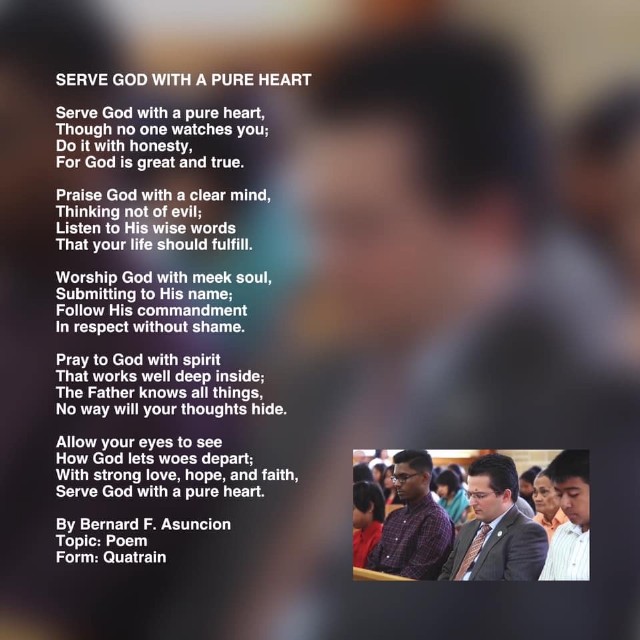 A beautiful spiritual write. Each stanza carries a message of deep faith in God. Yes, we have to serve God with a pure heart Excellent Quatrain, Bernard. Onto my Poem List.