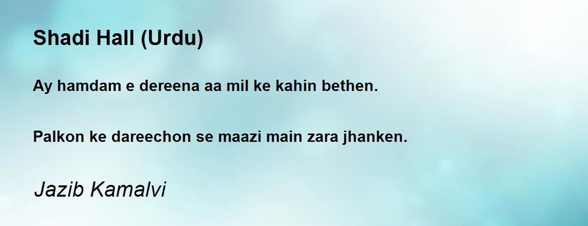 Though I amn't understanding clearly yet I mark that is a beautiful poem on love and friendship which is recited at the inauguration of Royal Marriage Hall established by Arshad Jamil and Shahid Jamil. Thank u dear Jazib for posting this.