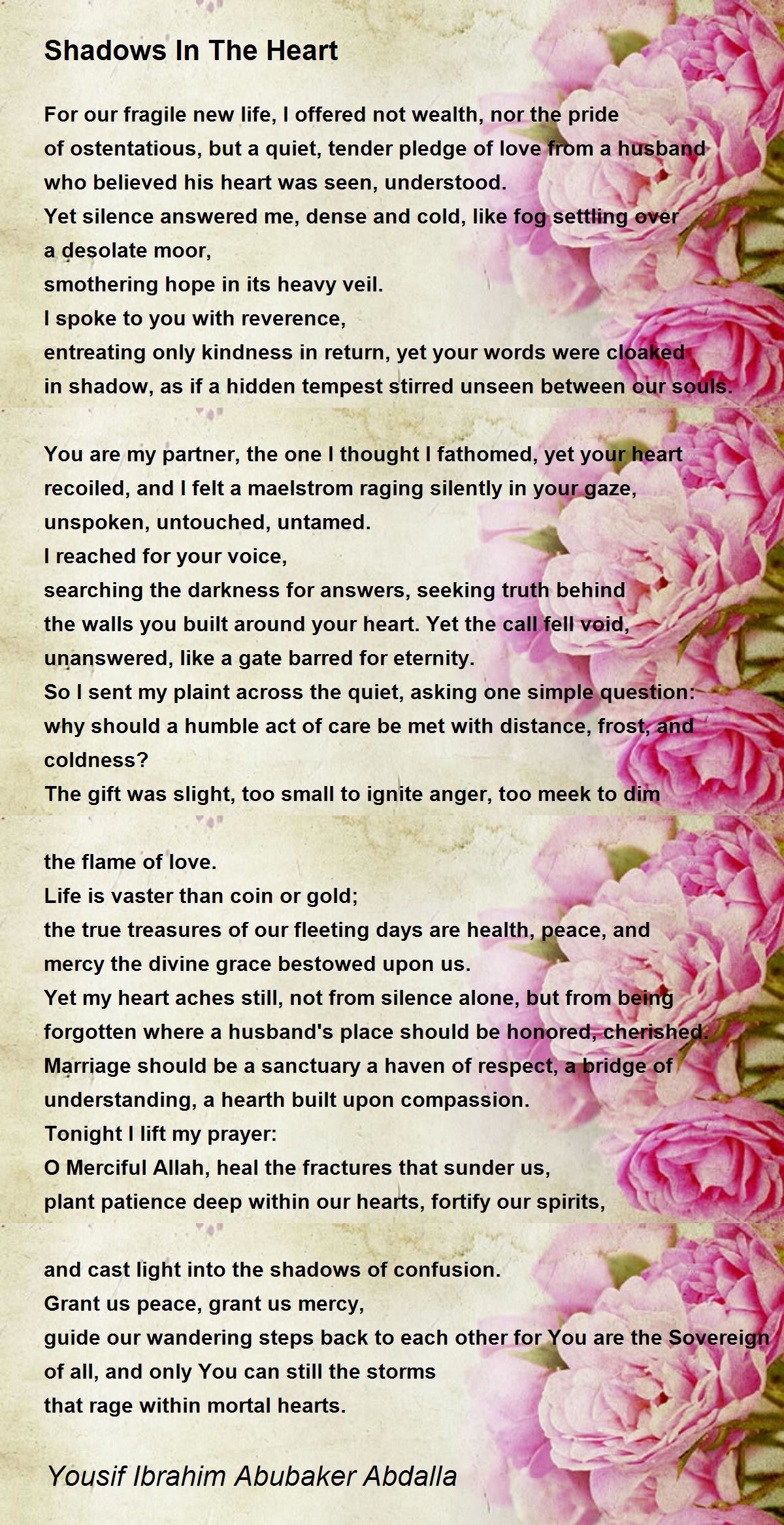 Yet my heart aches still, not from silence alone, but from being forgotten where a husband's place should be honored, cherished.
