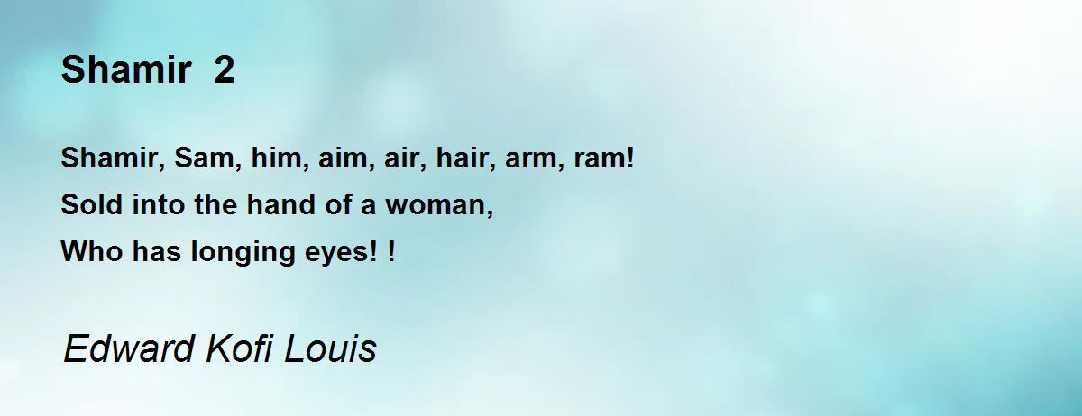 Shamir, Sam, him, aim, air, hair, arm, ram! Sold into the hand of a woman, Who has longing eyes! !