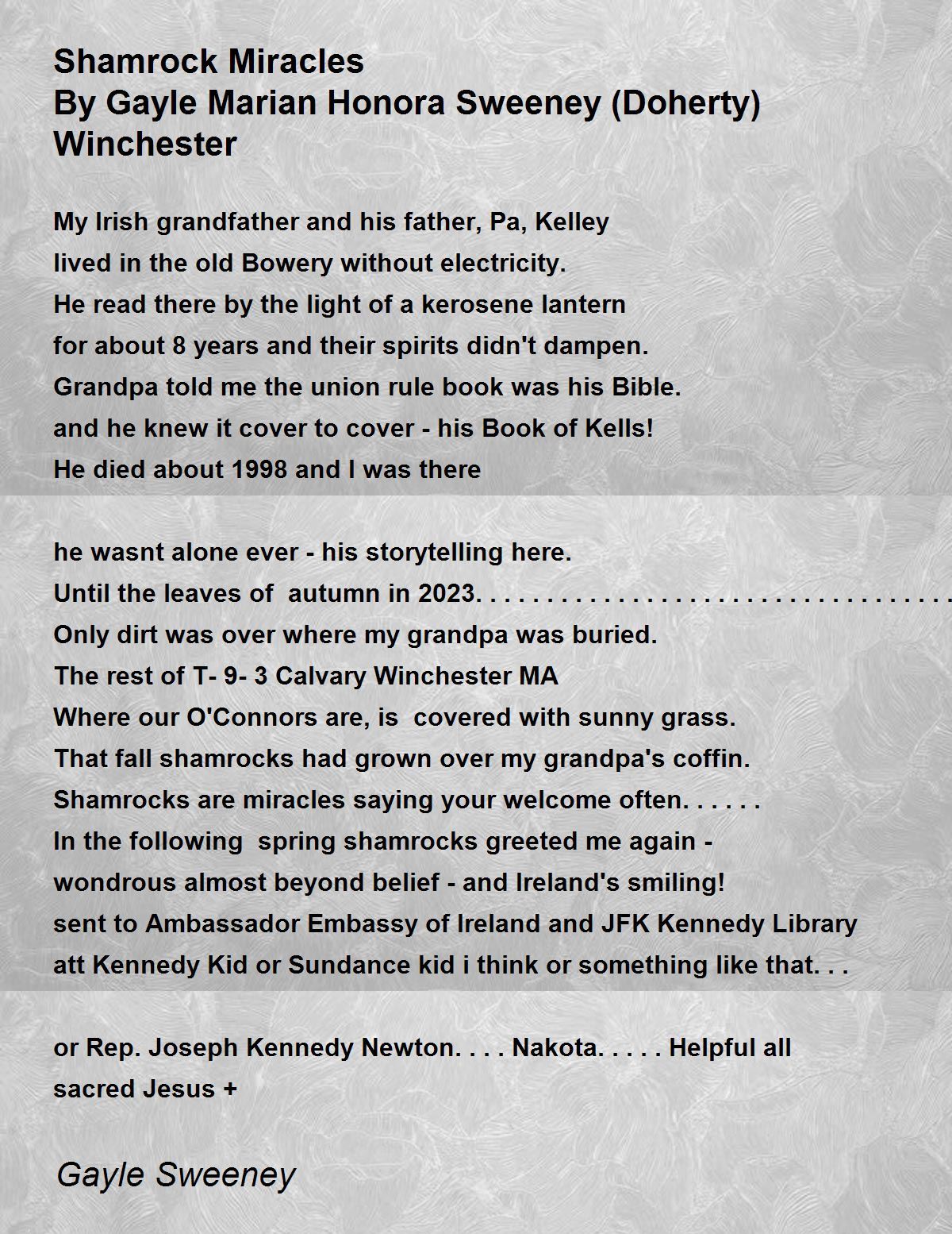My Irish grandfather and his father, Pa, Kelley lived in the old Bowery without electricity. He read there by the light of a kerosene lantern for about 8 years and their spirits didn't dampen. Grandpa told me the union rule book was his Bible. and he knew it cover to cover - his Book of Kells! He died about 1998 and I was there he wasnt alone ever - his storytelling here. Until the leaves of autumn in 2023........................................... Only dirt was over where my grandpa was buried. The rest of T-9-3 Calvary Winchester MA Where our O'Connors are, is covered with sunny grass. That fall shamrocks had grown over my grandpa's coffin. Shamrocks are miracles saying your welcome often...... In the following spring shamrocks greeted me again - wondrous almost beyond belief - and Ireland's smiling! sent to Ambassador Embassy of Ireland and JFK Kennedy Library att Kennedy Kid or Sundance kid i think or something like that... or Rep. Joseph Kennedy Newton....Nakota..... Helpful all sacred Jesus +