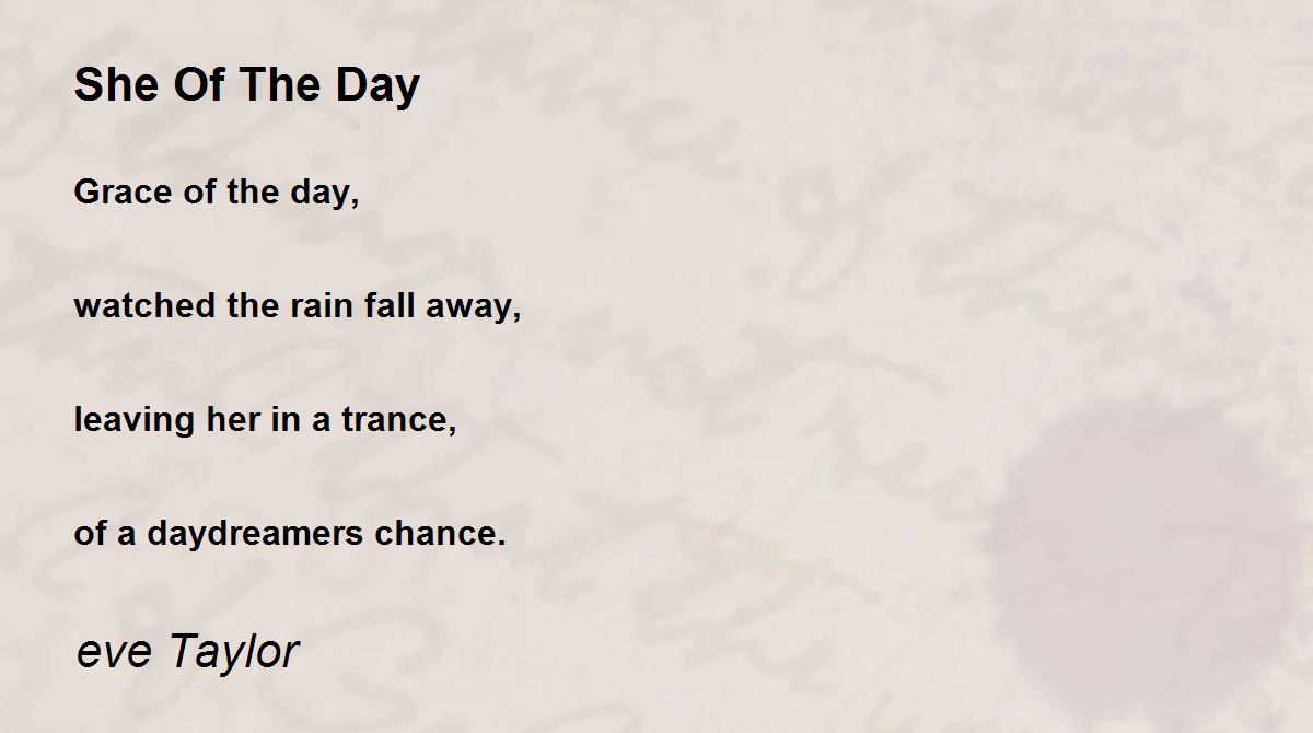 Grace of the day, watched the rain fall away, leaving her in a trance, of a daydreamers chance.