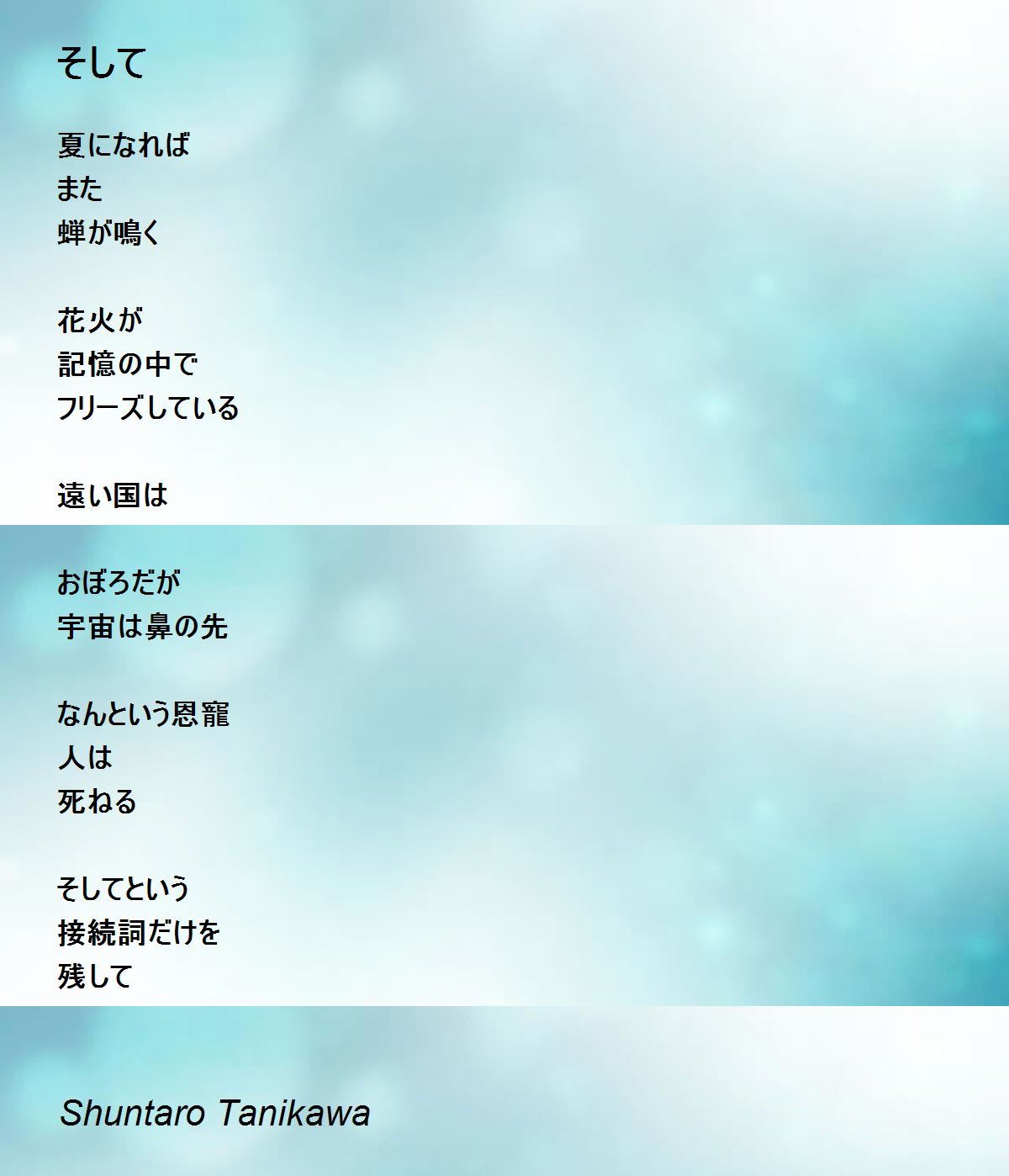 夏になれば また 蝉が鳴く 花火が 記憶の中で フリーズしている 遠い国は おぼろだが 宇宙は鼻の先 なんという恩寵 人は 死ねる そしてという 接続詞だけを 残して