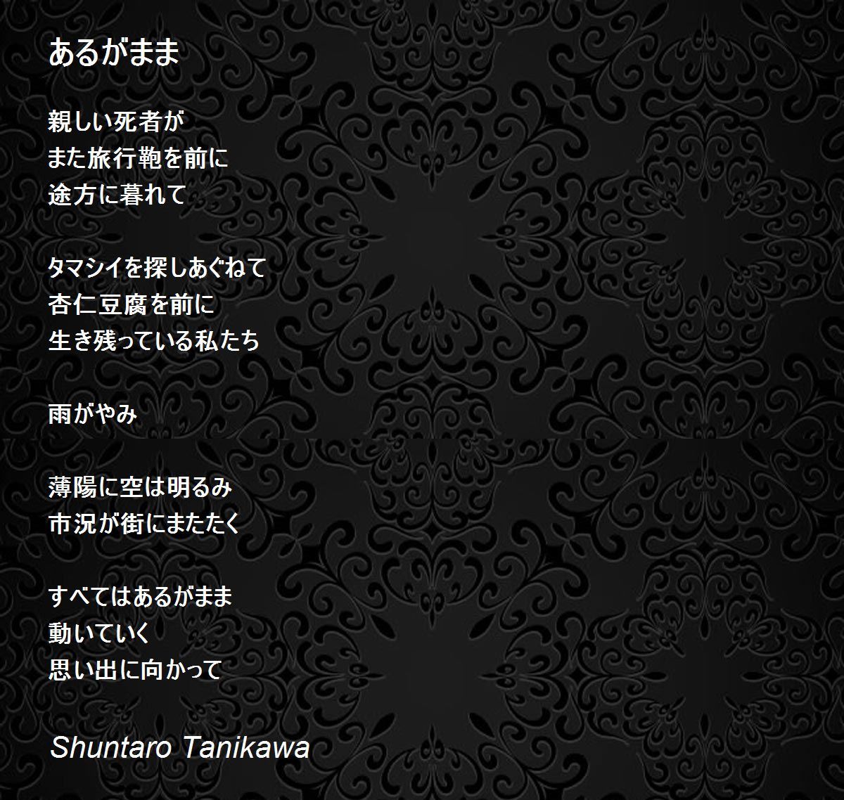 親しい死者が また旅行鞄を前に 途方に暮れて タマシイを探しあぐねて 杏仁豆腐を前に 生き残っている私たち 雨がやみ 薄陽に空は明るみ 市況が街にまたたく すべてはあるがまま 動いていく 思い出に向かって