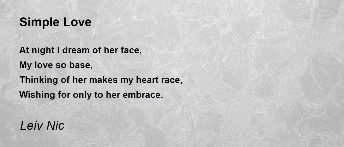 At night I dream of her face, My love so base, Thinking of her makes my heart race, Wishing for only to her embrace.