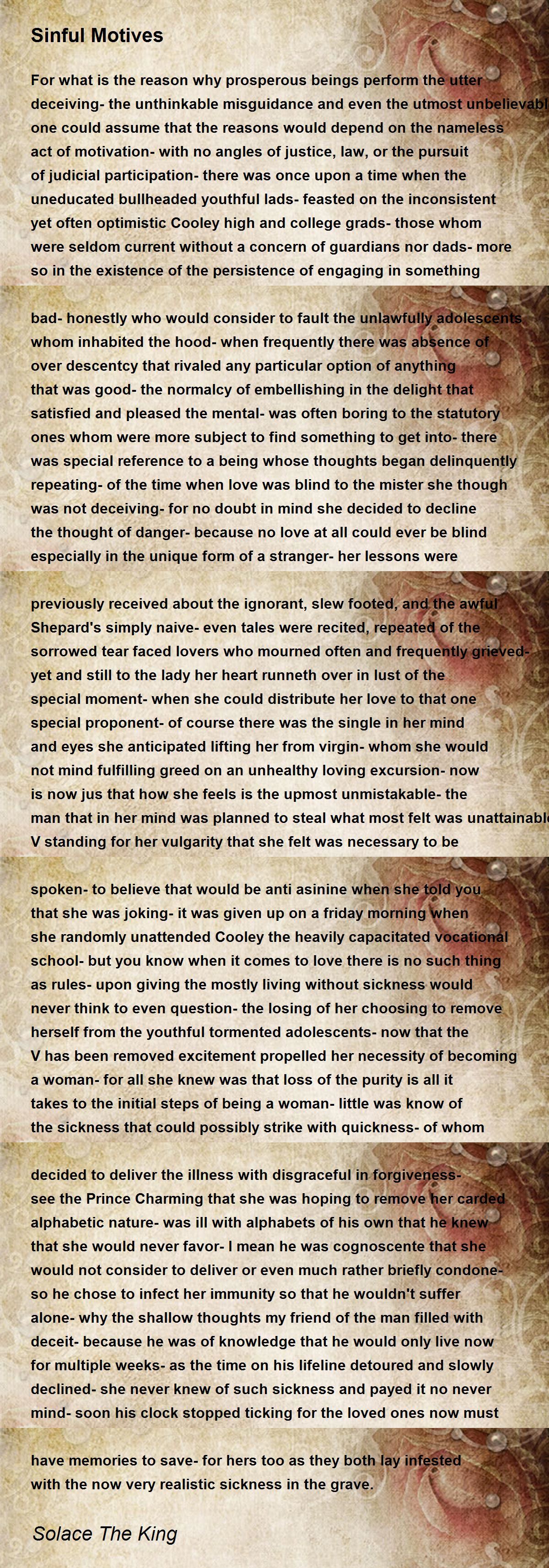 For what is the reason why prosperous beings perform the utter deceiving- the unthinkable misguidance and even the utmost unbelievable- one could assume that the reasons would depend on the nameless act of motivation- with no angles of justice, law, or the pursuit of judicial participation- there was once upon a time when the uneducated bullheaded youthful lads- feasted on the inconsistent yet often optimistic Cooley high and college grads- those whom were seldom current without a concern of guardians nor dads- more so in the existence of the persistence of engaging in something bad- honestly who would consider to fault the unlawfully adolescents whom inhabited the hood- when frequently there was absence of over descentcy that rivaled any particular option of anything that was good- the normalcy of embellishing in the delight that satisfied and pleased the mental- was often boring to the statutory ones whom were more subject to find something to get into- there was special reference to a being whose thoughts began delinquently repeating- of the time when love was blind to the mister she though was not deceiving- for no doubt in mind she decided to decline the thought of danger- because no love at all could ever be blind especially in the unique form of a stranger- her lessons were previously received about the ignorant, slew footed, and the awful Shepard's simply naive- even tales were recited, repeated of the sorrowed tear faced lovers who mourned often and frequently grieved- yet and still to the lady her heart runneth over in lust of the special moment- when she could distribute her love to that one special proponent- of course there was the single in her mind and eyes she anticipated lifting her from virgin- whom she would not mind fulfilling greed on an unhealthy loving excursion- now is now jus that how she feels is the upmost unmistakable- the man that in her mind was planned to steal what most felt was unattainable- V standing for her vulgarity that she felt was necessary to be spoken- to believe that would be anti asinine when she told you that she was joking- it was given up on a friday morning when she randomly unattended Cooley the heavily capacitated vocational school- but you know when it comes to love there is no such thing as rules- upon giving the mostly living without sickness would never think to even question- the losing of her choosing to remove herself from the youthful tormented adolescents- now that the V has been removed excitement propelled her necessity of becoming a woman- for all she knew was that loss of the purity is all it takes to the initial steps of being a woman- little was know of the sickness that could possibly strike with quickness- of whom decided to deliver the illness with disgraceful in forgiveness- see the Prince Charming that she was hoping to remove her carded alphabetic nature- was ill with alphabets of his own that he knew that she would never favor- I mean he was cognoscente that she would not consider to deliver or even much rather briefly condone- so he chose to infect her immunity so that he wouldn't suffer alone- why the shallow thoughts my friend of the man filled with deceit- because he was of knowledge that he would only live now for multiple weeks- as the time on his lifeline detoured and slowly declined- she never knew of such sickness and payed it no never mind- soon his clock stopped ticking for the loved ones now must have memories to save- for hers too as they both lay infested with the now very realistic sickness in the grave.