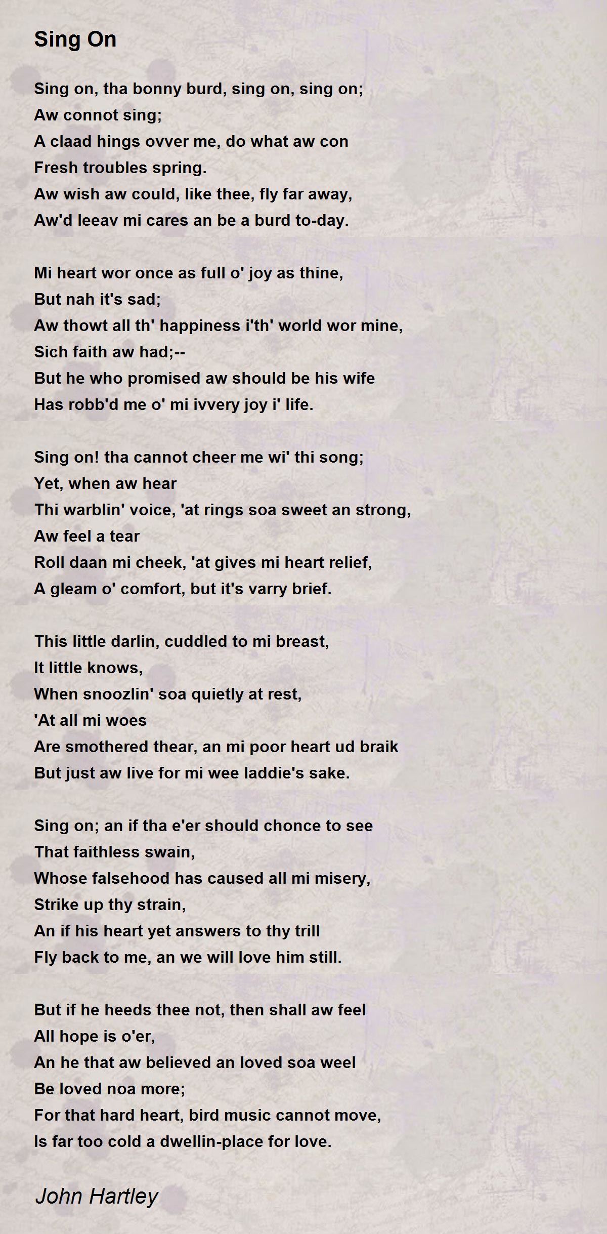 Sing on; an if tha e'er should chonce to see