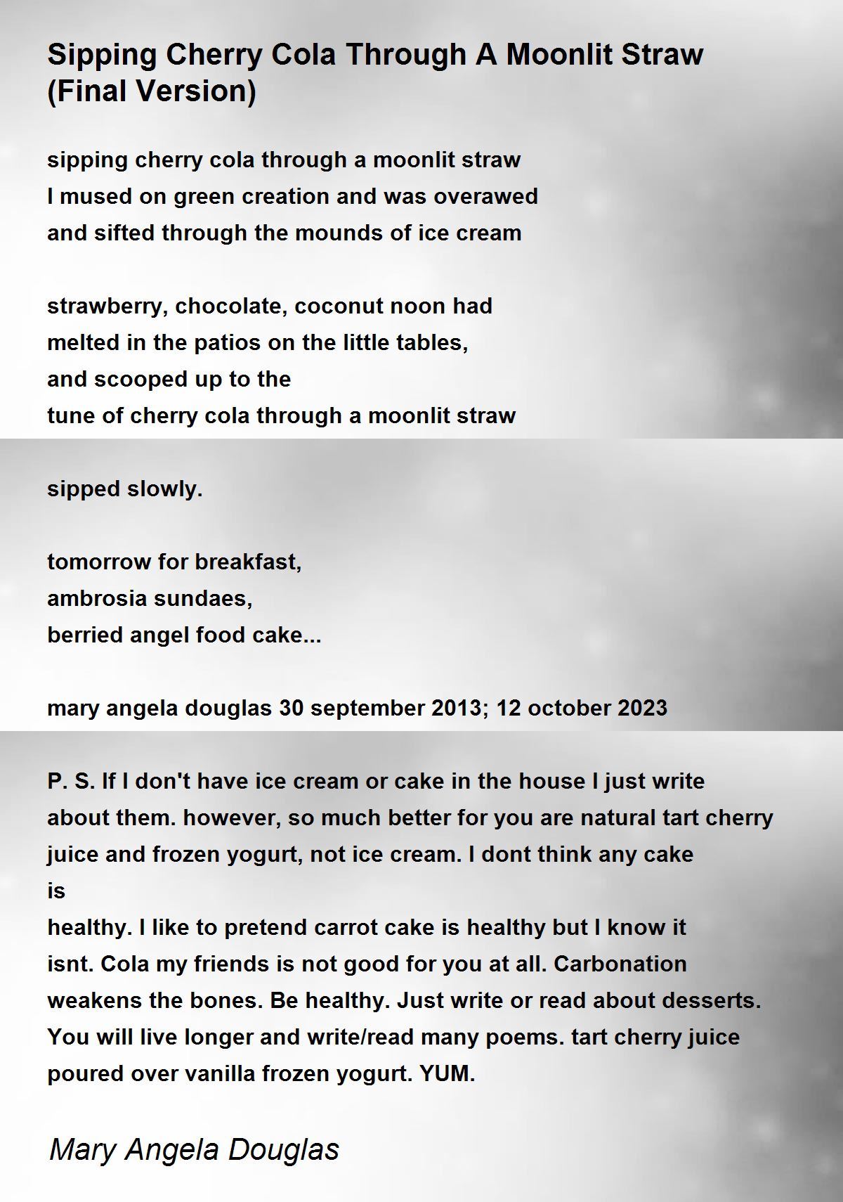 healthy. I like to pretend carrot cake is healthy but I know it isnt. Cola my friends is not good for you at all. Carbonation weakens the bones. Be healthy. Just write or read about desserts. You will live longer and write/read many poems. tart cherry juice poured over vanilla frozen yogurt. YUM.