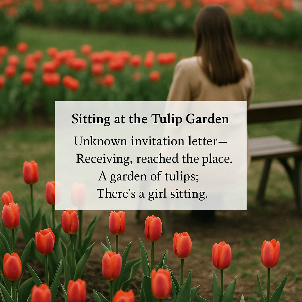 Unknown invitation letter— Receiving, reached the place. A garden of tulips; There's a girl sitting.