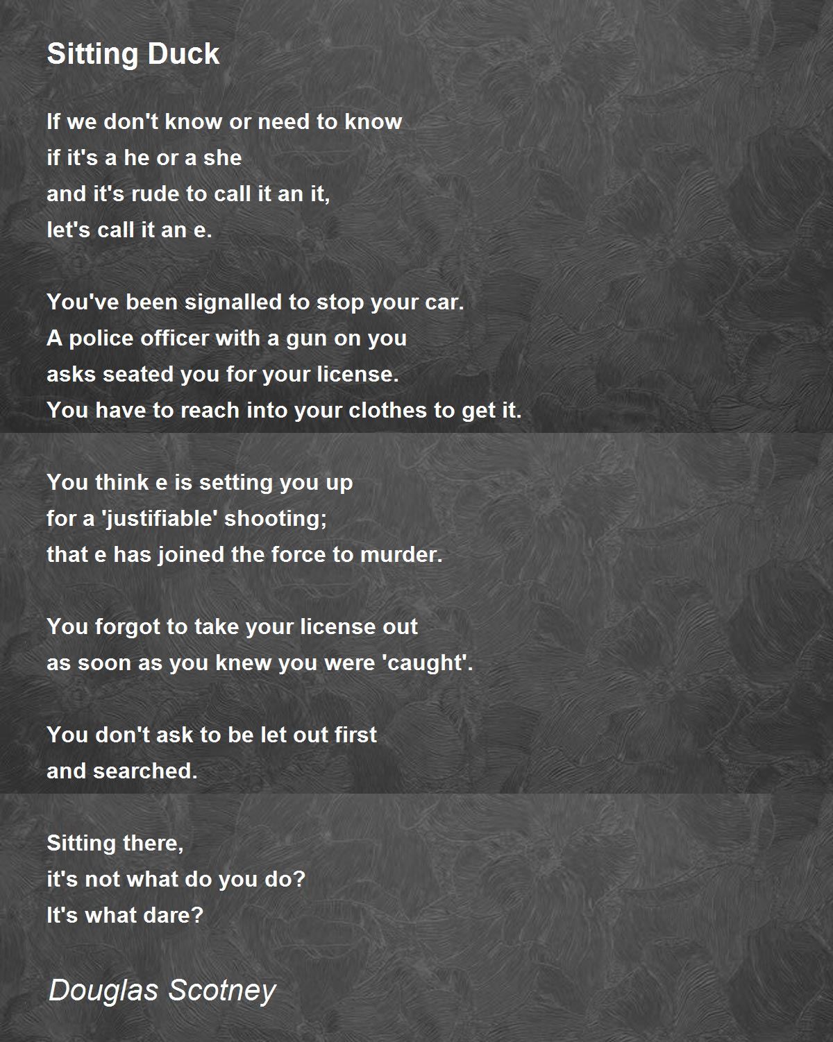 This is difficult to identify the gender of sitting duck. Police with gun asks for license. Amazing traffic control is caught in perception. An excellent presentation is made here...10