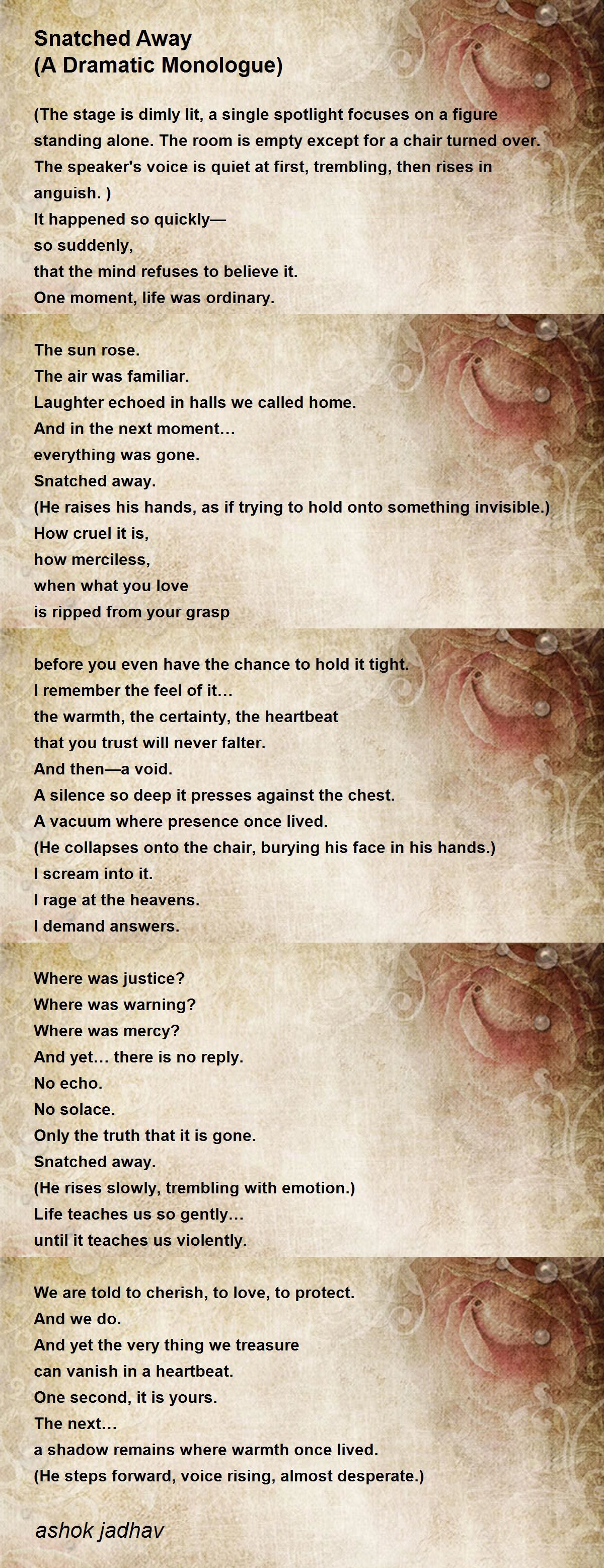 (The stage is dimly lit, a single spotlight focuses on a figure standing alone. The room is empty except for a chair turned over. The speaker's voice is quiet at first, trembling, then rises in anguish.)
